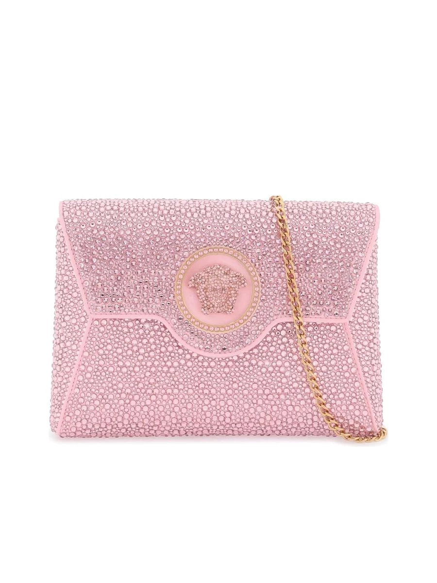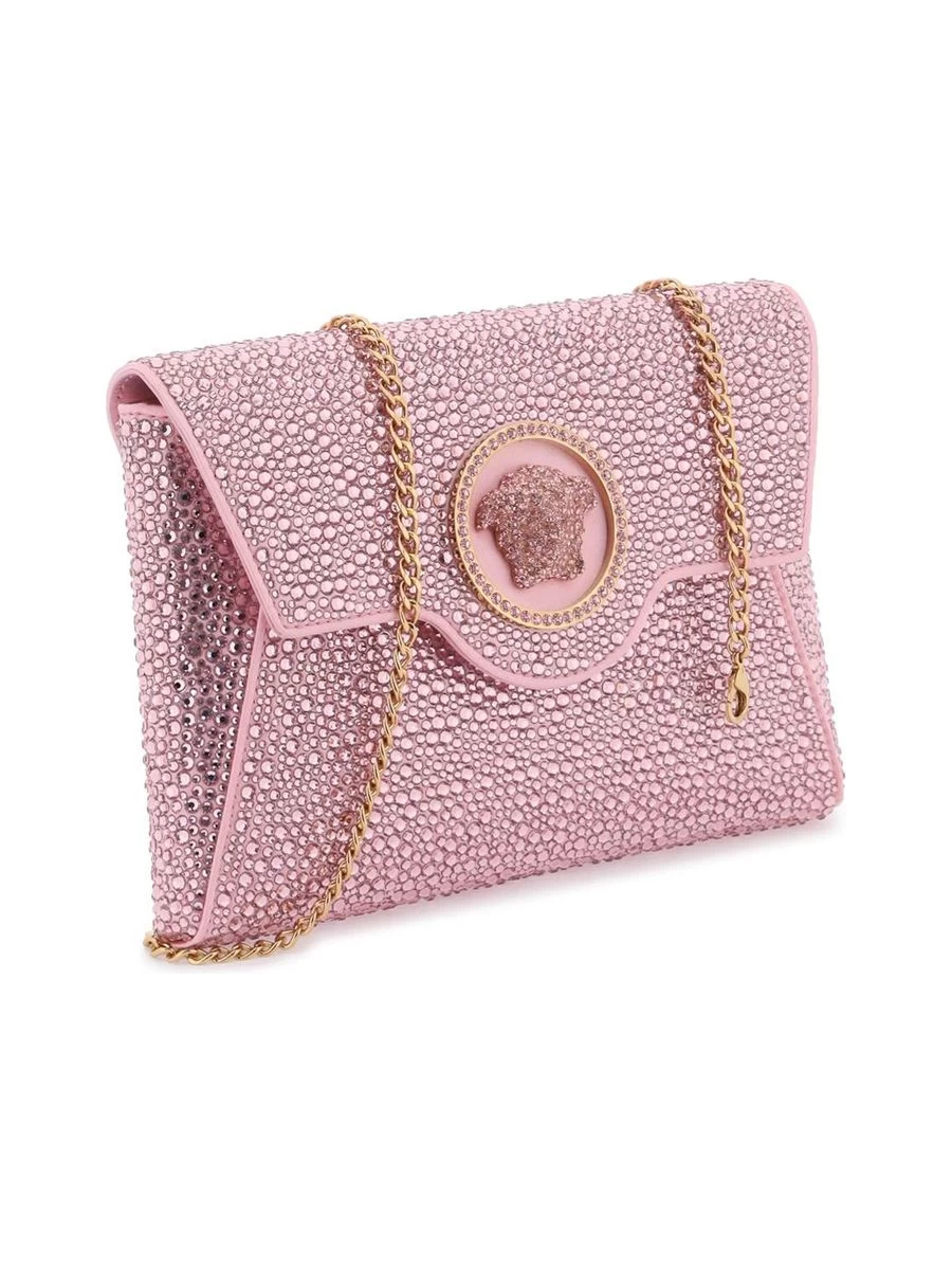 Add a touch of sparkle to your evening outfit with this chic envelope clutch. Embellished with all-over applied crystals and finished with the iconic rhinestone-covered Medusa on the flap. Features a luxurious leather interior and a detachable chain strap for versatile styling.