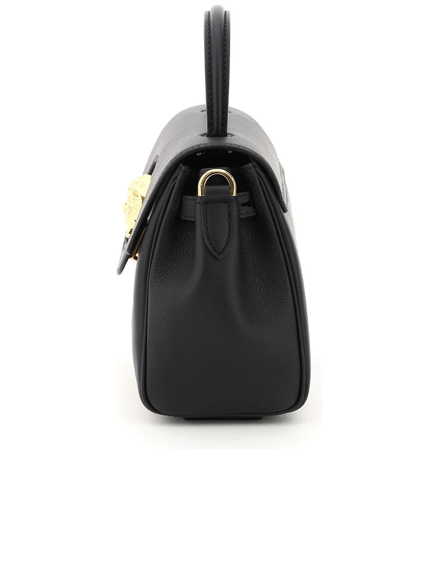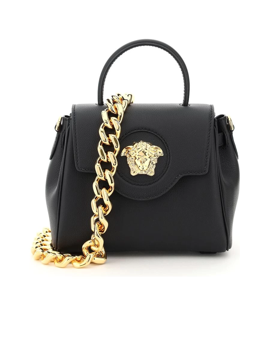 Indulge in the opulence of the ‘La Medusa’ Mini Bag from the esteemed house of Versace. Crafted with consummate craftsmanship from grained leather, this exquisite piece boasts a flap with a magnetic summary, adorned with the iconic Versace Medusa head in metal. The bag offers versatility with its single handle, detachable chain shoulder strap, and leather crossbody option. Its interior is elegantly finished in leather, complete with a practical open flat pocket, while the exterior shines with gold-toned logo lettering and sleek side straps.