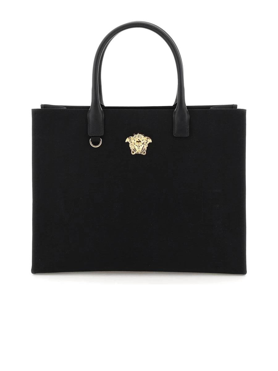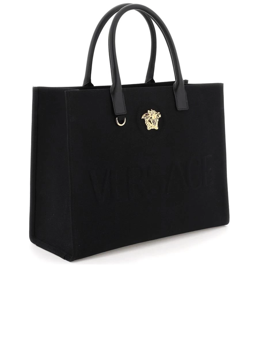 Indulge in the elegance of this La Medusa tote by Versace, a timeless piece that blends functionality with high-fashion allure. The bag flaunts a cotton canvas construction paired with sophisticated leather handles, while the front boasts an embossed logo alongside Versace’s iconic gold metal Medusa for a touch of luxury. The press-stud closure and D-ring detail accentuate its exquisite design, with the unlined interior offering practical zipped pockets.