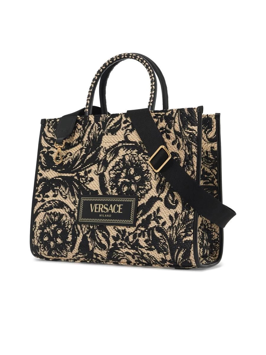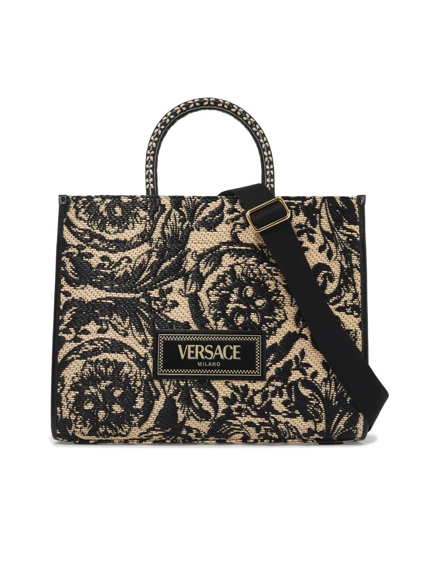 Crafted from raffia with a traditional Barocco pattern, this medium tote bag offers a touch of luxury with its hand-stitched double leather handles and embossed ’90s Vintage Logo. The gold-finished metallic accessories further enhance its opulent look. To organise your essentials, the interior comes equipped with a zip pocket, and the bag also boasts an adjustable and removable ribbon shoulder strap for versatile carrying options.