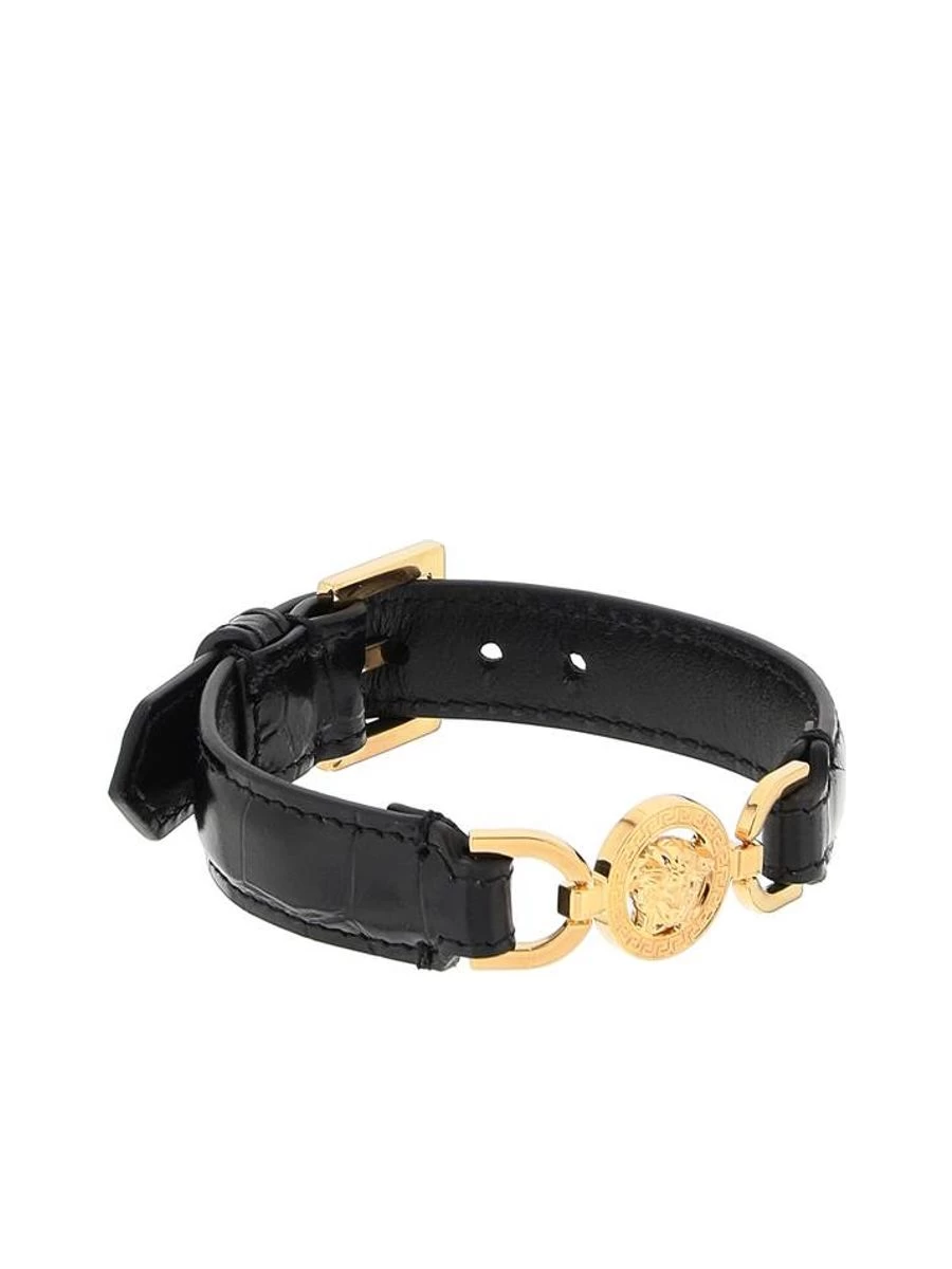 Embellish your wrist with a touch of distinct flair from Versace’s crocodile print leather bracelet. Apt for a refined yet bold statement, the accessory boasts a signature ’95 Medusa detail and Greek key design in lustrous metal. Expert Italian craftsmanship ensures a durable and stylish piece, complete with an adjustable buckle for the perfect fit.