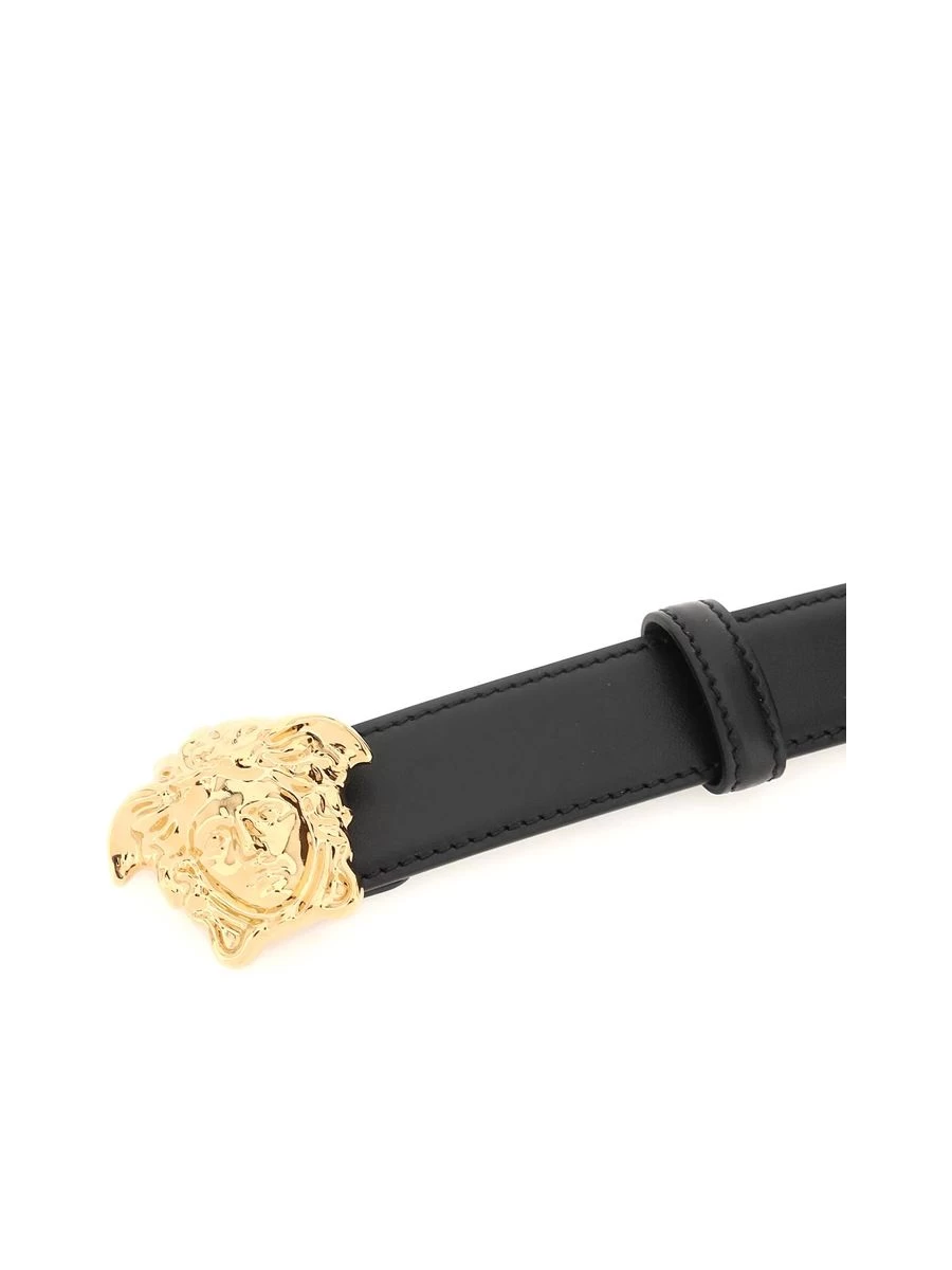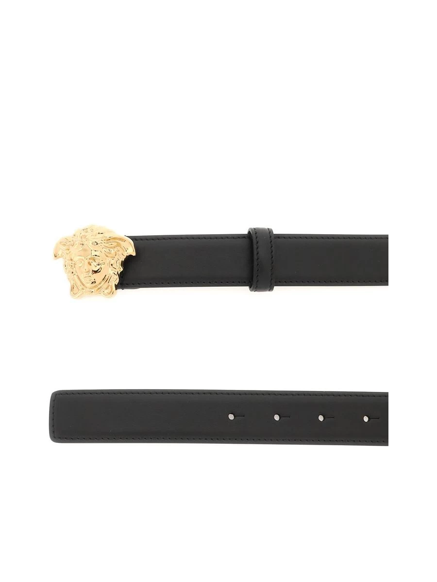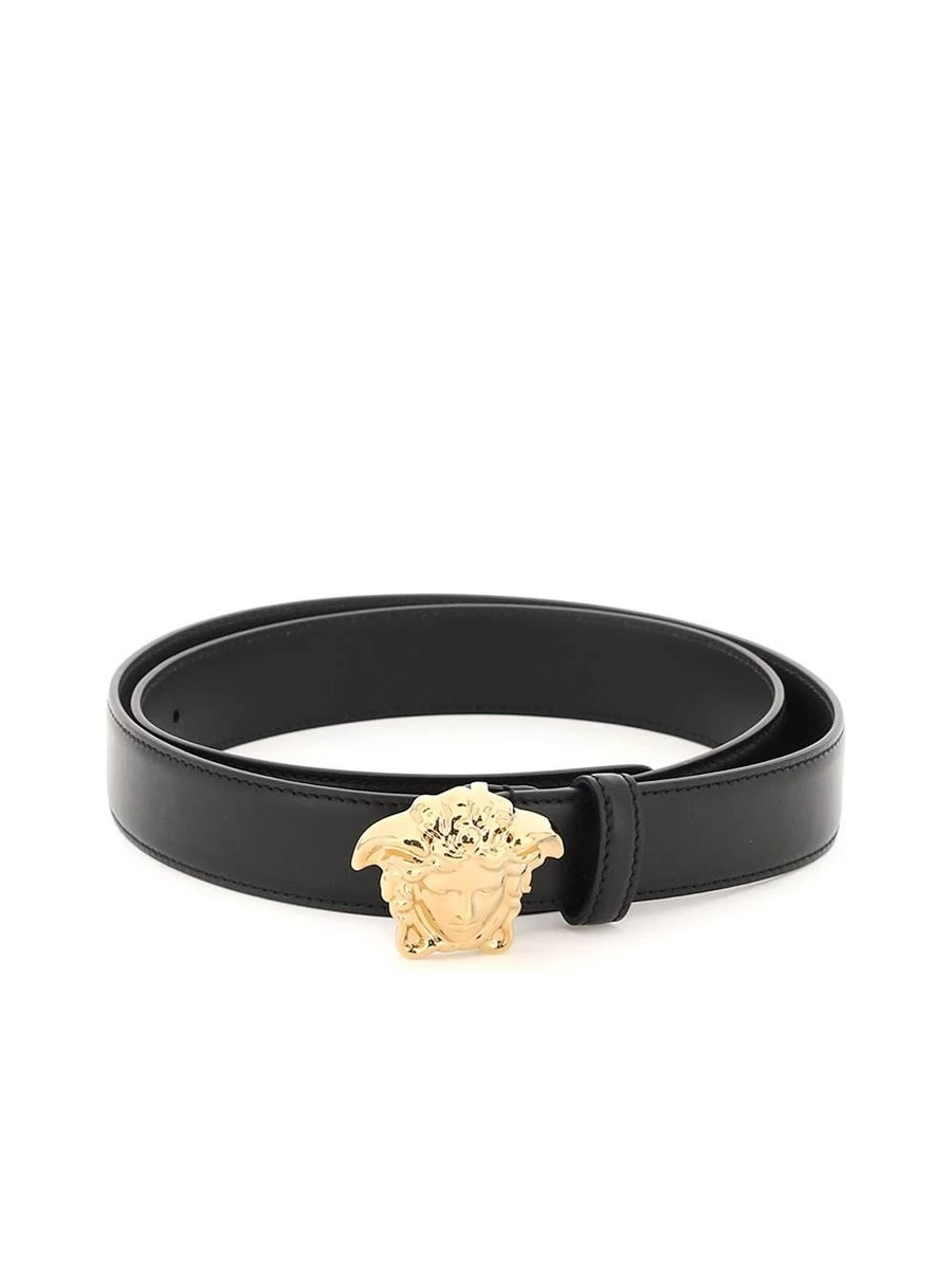 Elevate your accessory collection with this sleek leather belt featuring a distinctive Medusa pin buckle in a lustrous gold finish. Crafted in Italia, it offers a sophisticated touch to any ensemble while boasting Versace’s iconic design.