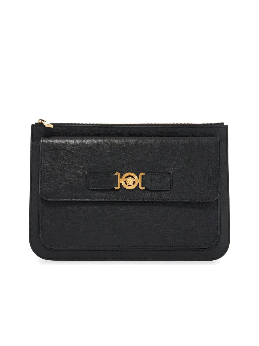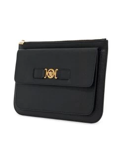 A hammered leather pouch adorned with the iconic golden Biggie Medusa emblem, designed with practicality in mind. It features an easily accessible zipper-enclosed main compartment, lined with nylon. Inside, you’ll find an open pocket and slots for six credit cards, perfect for organizing essentials. Finished with a detachable wrist handle for effortless portability.