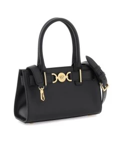 Exuding sophistication, this small shopper bag boasts the emblematic charm of Versace with its soft leather construction and Medusa embellishment. The practical design features a double magnetic closure, nappa-lined interior, expandable sides, and metallic feet, alongside a versatile double handle and detachable shoulder strap, all finished in radiant gold-tone accents.